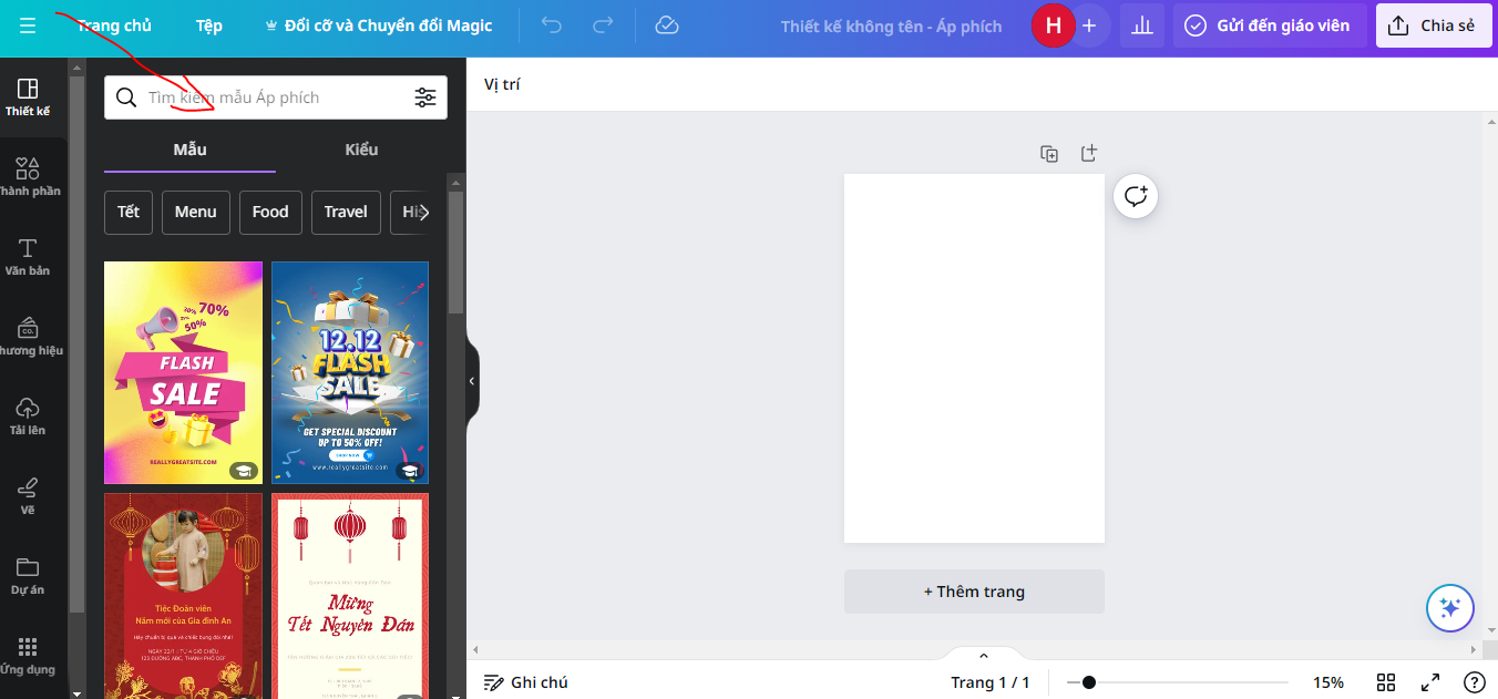 Trên thanh công cụ dọc sẽ hiện ra các mẫu có sẵn cho mọi người lựa chọn hoặc mọi người có thể bấm vào tìm kiếm mẫu theo sở thích và mọi người chỉ việc chỉnh sủa lại nội dung theo ý mình mong muốn