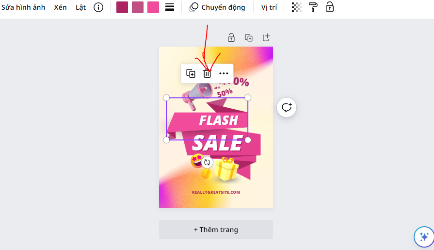 Tiếp theo, sau khi đã chọn được mẫu mọi người sẽ xóa bớt những nội dung không cần thết bằng cách bấm vào thành phần và bấm vào biểu tượng thùng giác