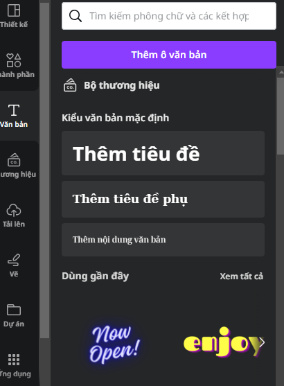 Để thêm văn bản vào trong thiết kế mọi người bấm vào phần văn bản trên thanh công cụ dọc và chọn vào ô văn bản và chọn kiểu chữ phông chữ và các thành phần khác và căn chỉnh lại phông chữ sao cho đẹp và phù hợp với thết kế