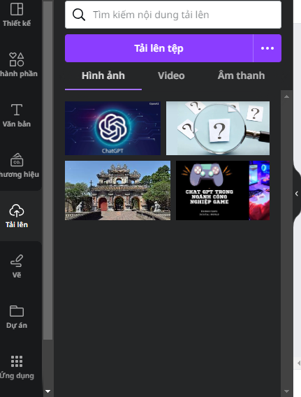 Mọi người muốn tải ảnh lên trên thết kế thì bấm vào mục tải lên và chọn ảnh tải lên và thêm vào thết kế